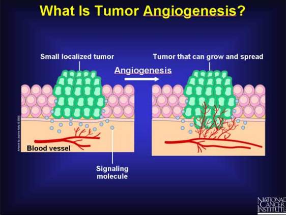 Tumor angiogenesis is the proliferation of a network of blood vessels that penetrates into cancerous growths, supplying nutrients and oxygen and removing waste products. Tumor angiogenesis actually starts with cancerous tumor cells releasing molecules that send signals to surrounding normal host tissue. This signaling activates certain genes in the host tissue that, in turn, make proteins to encourage growth of new blood vessels. Photo credit: NCI