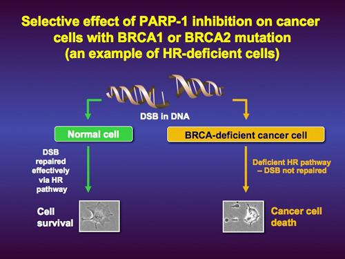 Cells lacking a properly functioning BRCA1 or BRCA2 gene are less able to repair DNA damage. These defective cells are more sensitive to (i) platinum-based chemotherapy drugs such as cisplatin – which work by causing double-stranded DNA breaks, and (ii) PARP inhibitors, a newer class of drugs which prevent cells lacking a properly functioning BRCA gene from being able to repair damaged DNA. PARP inhibitors have shown promise in clinical trials but, as with most drugs, resistance can develop meaning some women can stop responding.